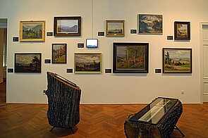 This reciprocal use of technology and artefacts continues throughout the exhibition, which at first follows a mostly chronological order. Separate thematic modules are integrated into the halls of the historic school building. After the introductory film, visitors are immersed into a rather cosy (heimelige) atmosphere made up of carved up wooden trunks – which serve as stands for a wide array of romantic nature paintings (Landschaftsmalerei) by German artists – and extensive media installation made up of multiple projectors and a sound system simulating a “forest and hills”-environment. A connection to the film is made through a reference to the “Altvater- and Riesengebirge” (the fatal race of two Czech skiers in 1913 is mentioned in the film) and the presentation of Emmerich Rath’s skies. Written in simple black letters on the white wall, the room’s central question also makes use of this connection to the Altvatergebirge, asking: “Where is my home? My fatherland?” Such thematic questions are used throughout the exhibition not only to separate the thematic arrangements but also to create a contrast with the otherwise heavy focus on installations used to contain and enact the exhibits themselves. While most of the historic artefacts in this room are placed in the middle, on one wall, media stations project collections of newer photographs, shot as a part of a contemporary project that revisited various historic sites. The link to the present is meant to illustrate that the current absence of Germans in the region is always present – not only in the exhibition.